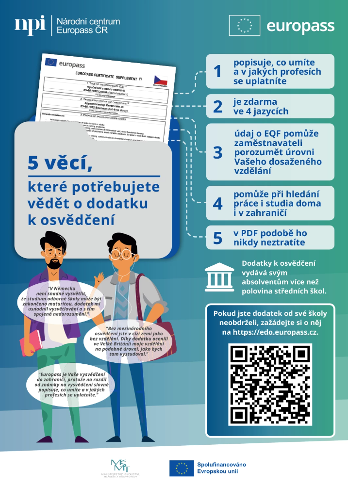 Europass je dodatek k maturitnímu vysvědčení v cizím jazyce (více ZDE). Je vhodný pro toho, kdo potřebuje doložit překlad maturitního vysvědčení v cizím jazyce, např. zahraniční zaměstnavatel, škola apod.