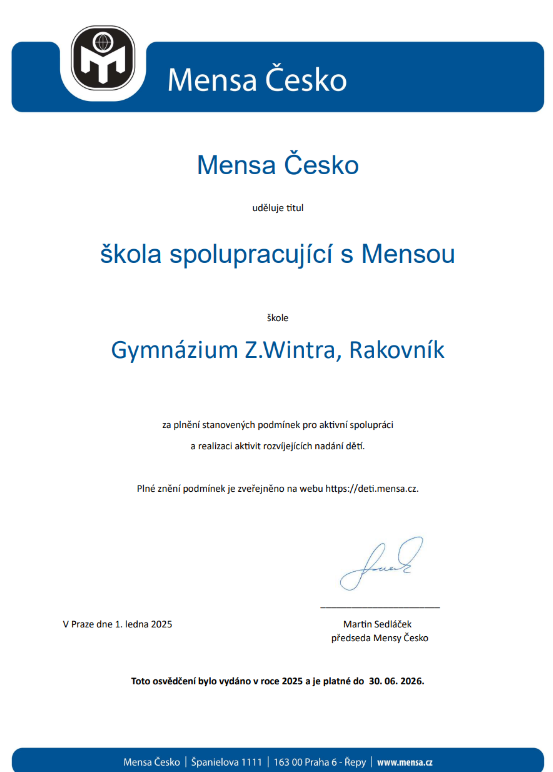 Těší nás, že patříme k těm školám, s nimiž navázala spolupráci Mensa ČR. Ta se na nás znovu obrátila s nabídkou testování IQ našich studentů. Zástupkyně této organizace k nám zavítá už ve čtvrtek 16. října 2025 a samotné zadávání testů proběhne během prvních dvou vyučovacích hodin.