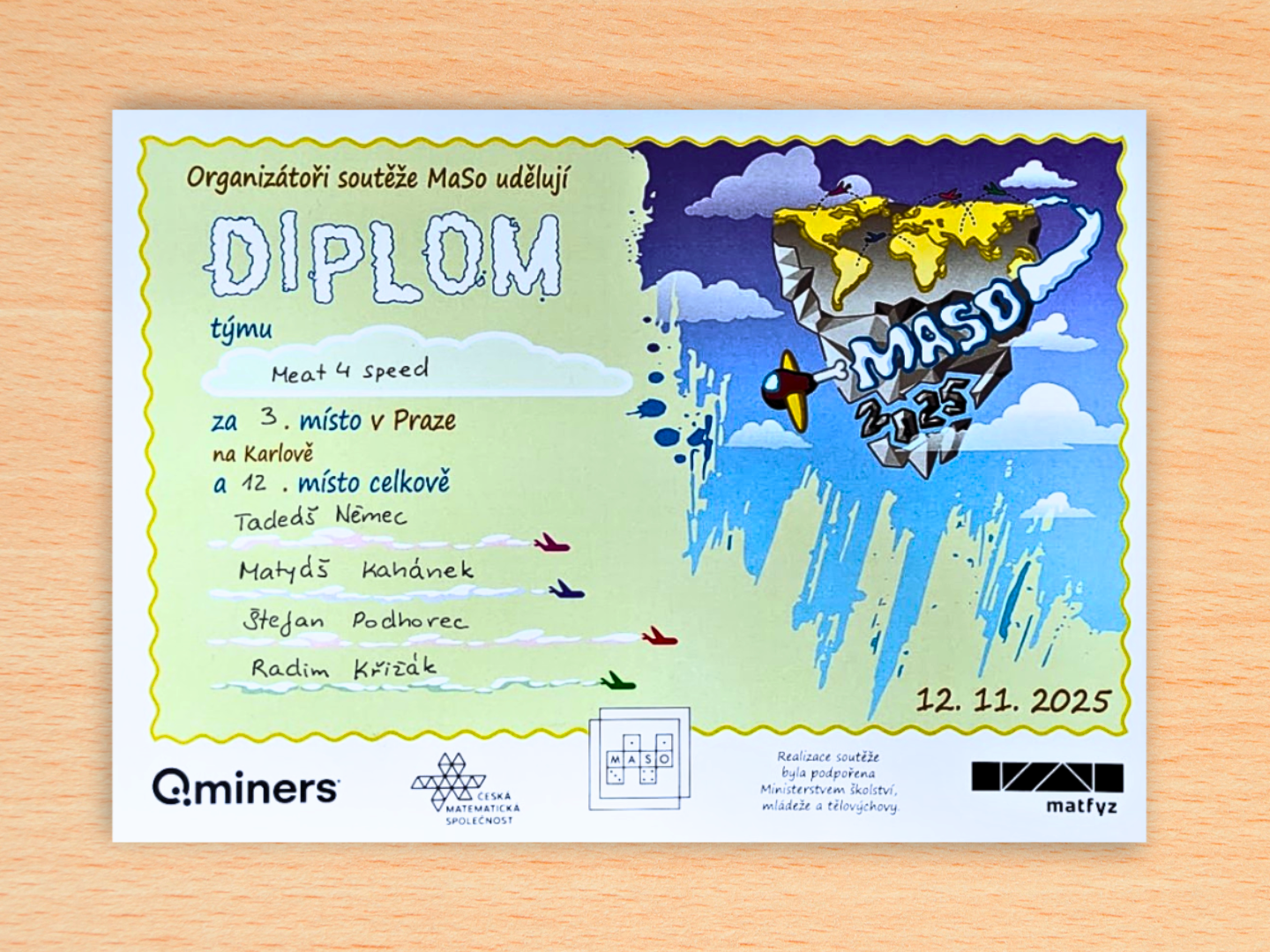 Středa 12. listopadu 2025 byla ve znamení matematiky a týmového ducha, naši žáci se zúčastnili celorepublikové soutěže MaSo. Tato populární soutěž, pořádaná Matematicko-fyzikální fakultou Univerzity Karlovy, probíhala na třinácti místech v devíti městech po celé České republice a letos přilákala 379 týmů.