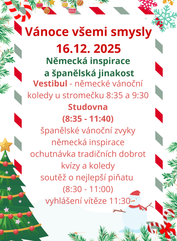 Ve středu 16. 12. 2025 nás čeká německá a španělská vánoční atmosféra, koledy ve vestibulu, ochutnávky, kvízy i soutěž o nejlepší piñatu.