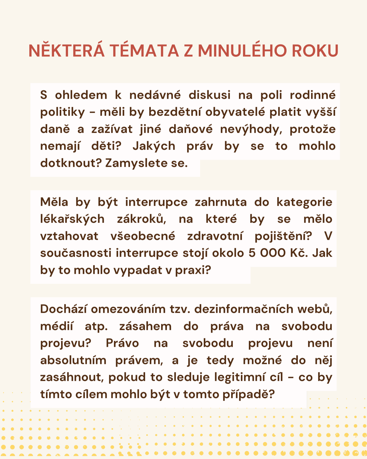 Finalistkám a finalistům budou několik týdnů před samotným finále zaslána finálová témata, která zhotovuje odborná porota sestavená z významných osobností české lidskoprávní sféry (minulý rok např. emeritní ústavní soudce David Uhlíř či emeritní ombudsmanka Anna Šabatová). Následně budou mít finalisté zhruba dva týdny čas na vypracování eseje na jedno z témat. V den samotného finále budou soutěžící své eseje obhajovat před odbornou porotou. Ta vybere devět nejlepších soutěžících, kteří postoupí do tzv. superfinále. Zde budou finalistky a finalisté odpovídat na (znalostní i praktické) dotazy poroty, založené na náhodně vylosované otázce týkající se aktuálního dění v oblasti lidských práv.