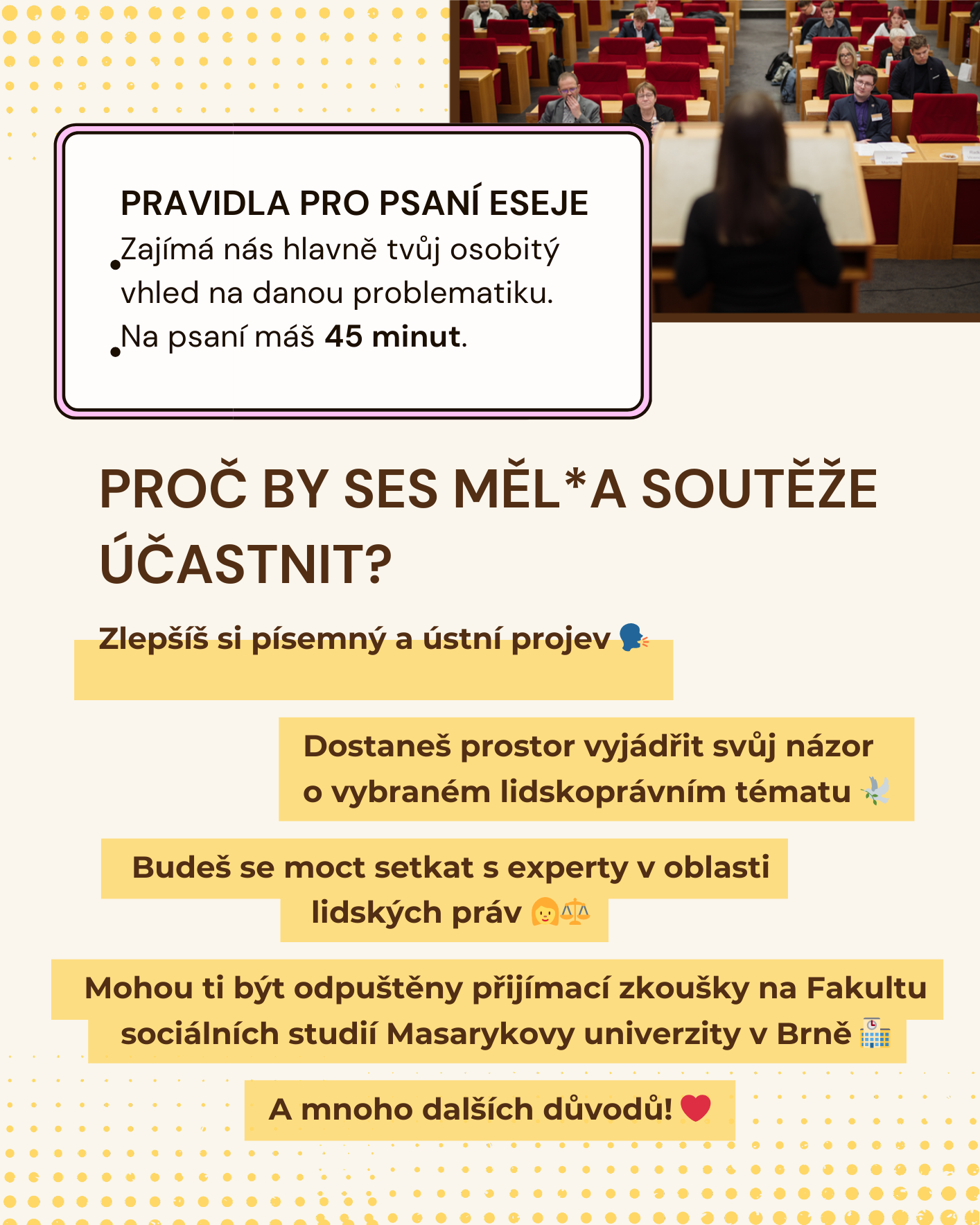Jde o jedinečnou možnost, jak dát studentstvu vhled do problematiky lidských práv a setkat se s aktivními vrstevníky z celé země. Soutěž je pozitivně hodnocena jejími účastníky, finalistky a finalisté si mohou odnést velmi hodnotné ceny. Mimo jiné je účast v Superfinále jedna z možností přijetí k bakalářskému studiu (kromě oboru Psychologie) na FSS MUNI bez přijímacích zkoušek.