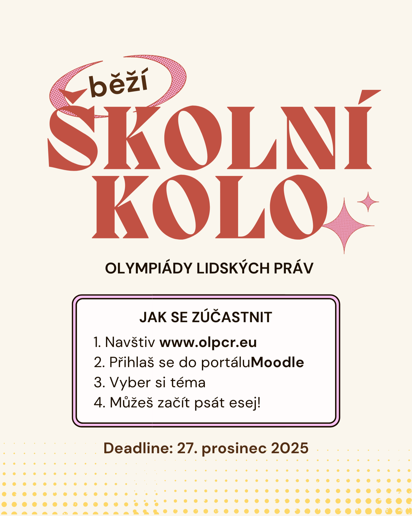 Soutěž probíhá ve dvou kolech. První kolo se koná online na stránkách https://olpcr.eu/ a probíhá od 1. listopadu do 27. prosince. Soutěžící/mu budou z dvanácti témat náhodně vygenerována tři témata, z nichž si jedno vybere a sepíše na něj krátkou esej. Po skončení školního kola organizační tým eseje vyhodnotí a přibližně 50 autorek a autorů nejlepších esejí postoupí do finálového kola, které se bude konat v březnu 2026 (přesné datum bude zvoleno na začátku roku 2026).