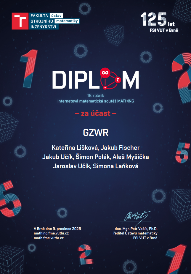 Dne 25. listopadu 2025 se sedm studentů našeho gymnázia zúčastnilo internetové matematické soutěže MATHING, kterou organizuje Ústav matematiky FSI VUT v Brně. Soutěž je určena středoškolským týmům a zaměřuje se na řešení netradičních a logicky náročných matematických úloh.