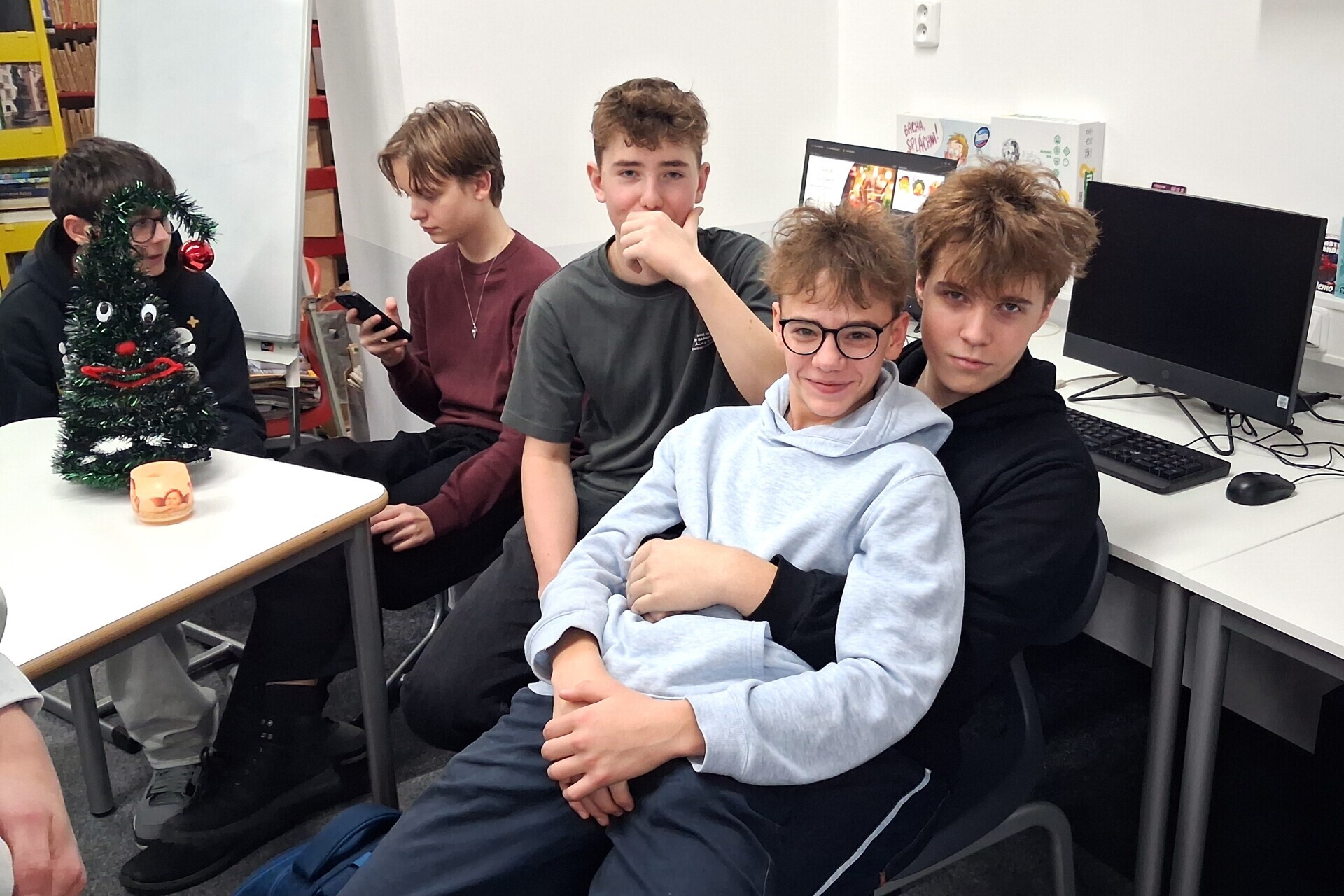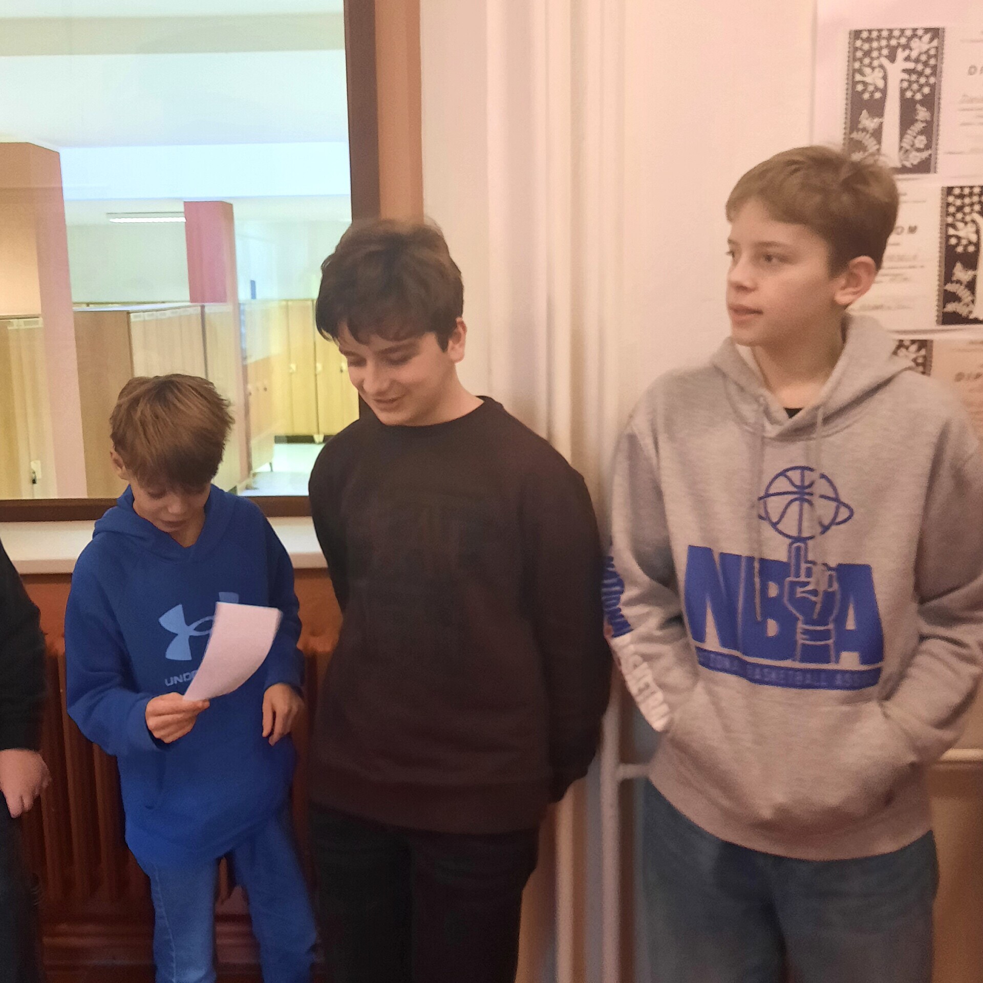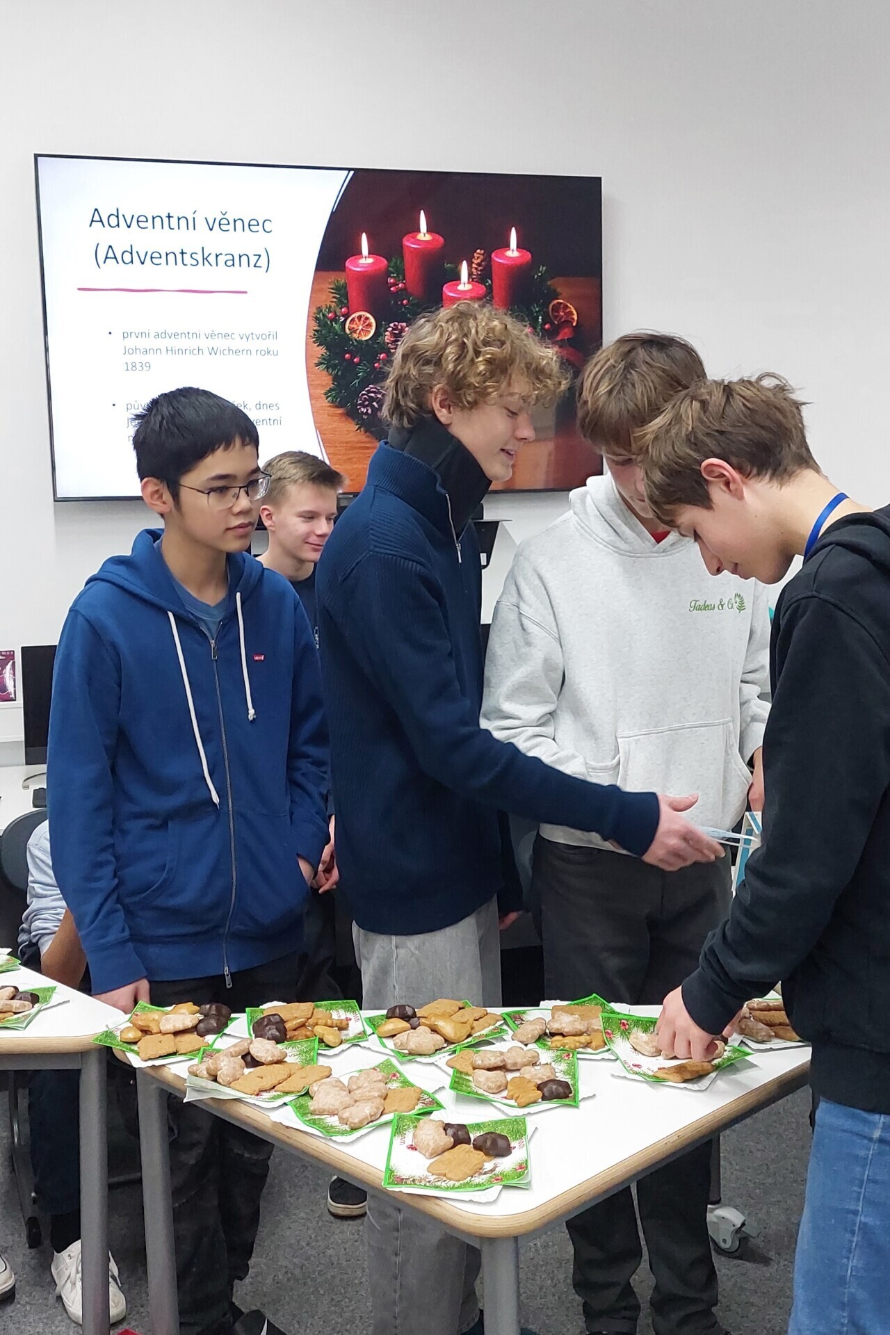 Co nám dali Němci? Možná Vás překvapí, kolik českých zvyků má kořeny u našich sousedů. Kvinta si připravila poutavou prezentaci na téma „Co nám dali Němci k Vánocům aneb co jsme odkoukali?“ Takové symboly Vánoc jako stromeček a adventní věnec k nám doputovaly právě z Německa. Němčináři z kvarty pak přichystali zábavný kvíz, ve kterém byla spousta zapeklitých otázek.