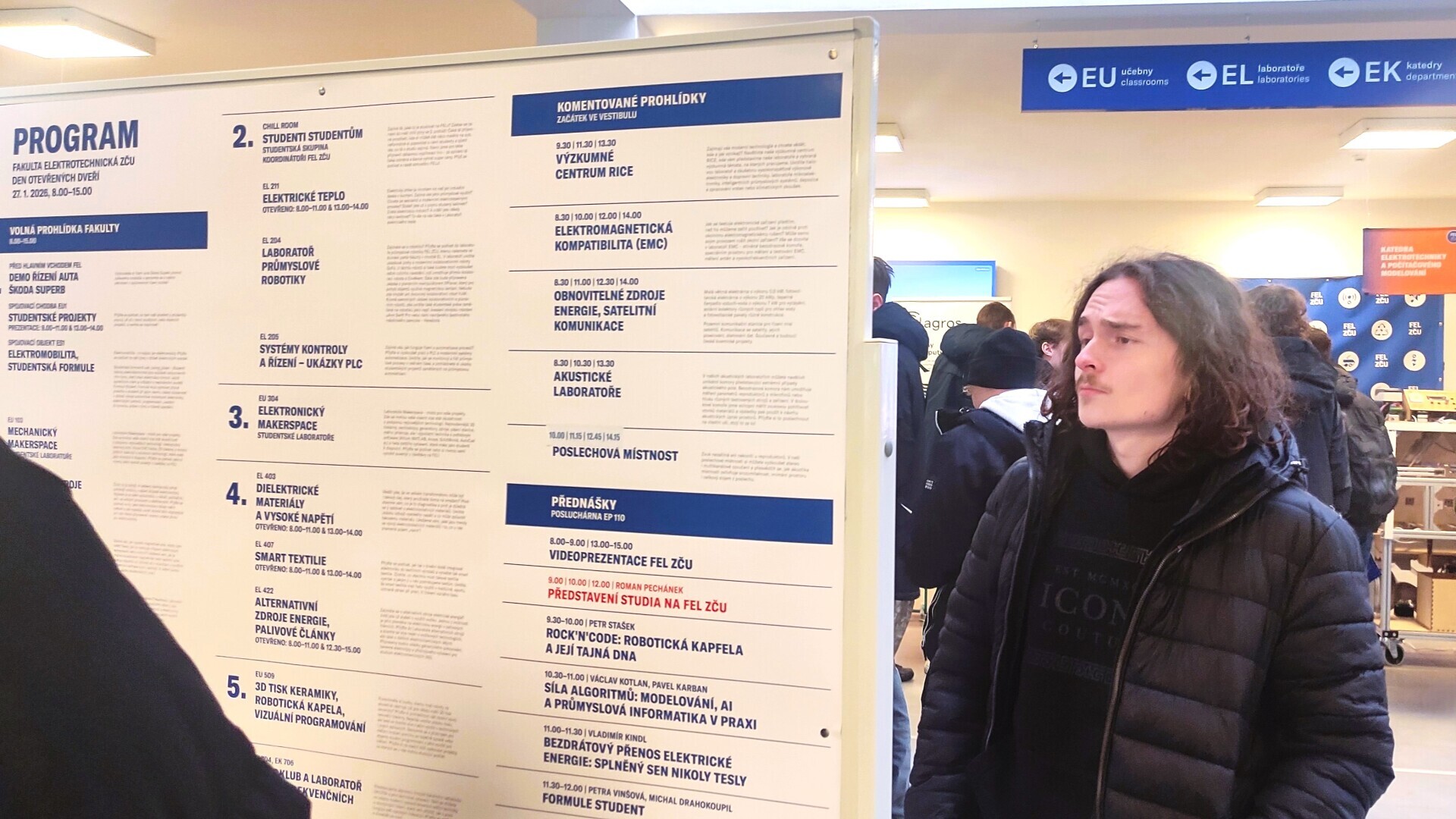 Na FEL bylo možné nahlédnout do řady laboratoří a pracovišť – od robotiky přes vysoké napětí až po pracoviště zaměřená na alternativní zdroje a palivové články či smart textilie. Součástí programu byly i přednáškové bloky, například robotická „kapela“ Rock’n’Code, AI a průmyslová informatika, demonstrace bezdrátového přenosu energie a prezentace studentského týmu Formule Student. Nechyběl ani Makerspace (dílny) a venku u budovy ukázka autonomního řízení. Na FAV studenti narazili na moderní technologie – humanoidního robota, virtuální realitu, robotické ukázky, prezentaci univerzitního satelitu PilsenCUBE a také kvantové počítání a informatiku.