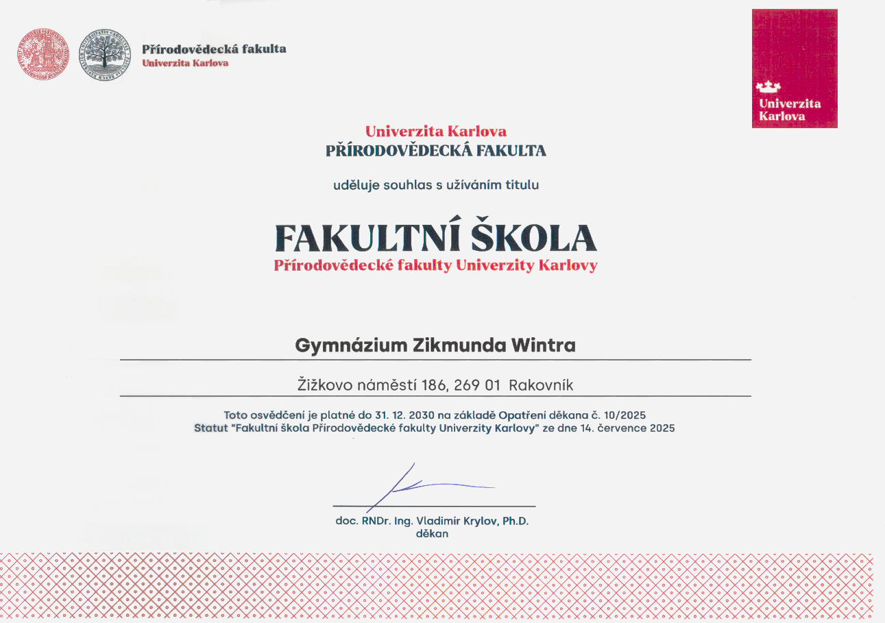 Pátek 16. 1. 2026 byl pro naše gymnázium důležitým dnem. Ředitel školy Mgr. Tomáš Kopřiva, vyučující Ing. Kamil Březina a 11 vybraných studentů vyšších ročníků se vypravili do Prahy na Přírodovědeckou fakultu Univerzity Karlovy. Studenti zde měli v rámci dne otevřených dveří možnost prohlédnout si jednotlivé budovy fakulty a vyslechnout informační přednášky o studijních oborech všech sekcí fakulty. Ředitel školy se zúčastnil v mineralogické posluchárně slavnostního setkání představitelů spolupracujících škol Přírodovědecké fakulty, na kterém její děkan doc. RNDr. Ing. Vladimír Krylov, Ph.D. propůjčil Gymnáziu Zikmunda Wintra v Rakovníku titul Fakultní škola Přírodovědecké fakulty Univerzity Karlovy na další období let 2026 – 2030.