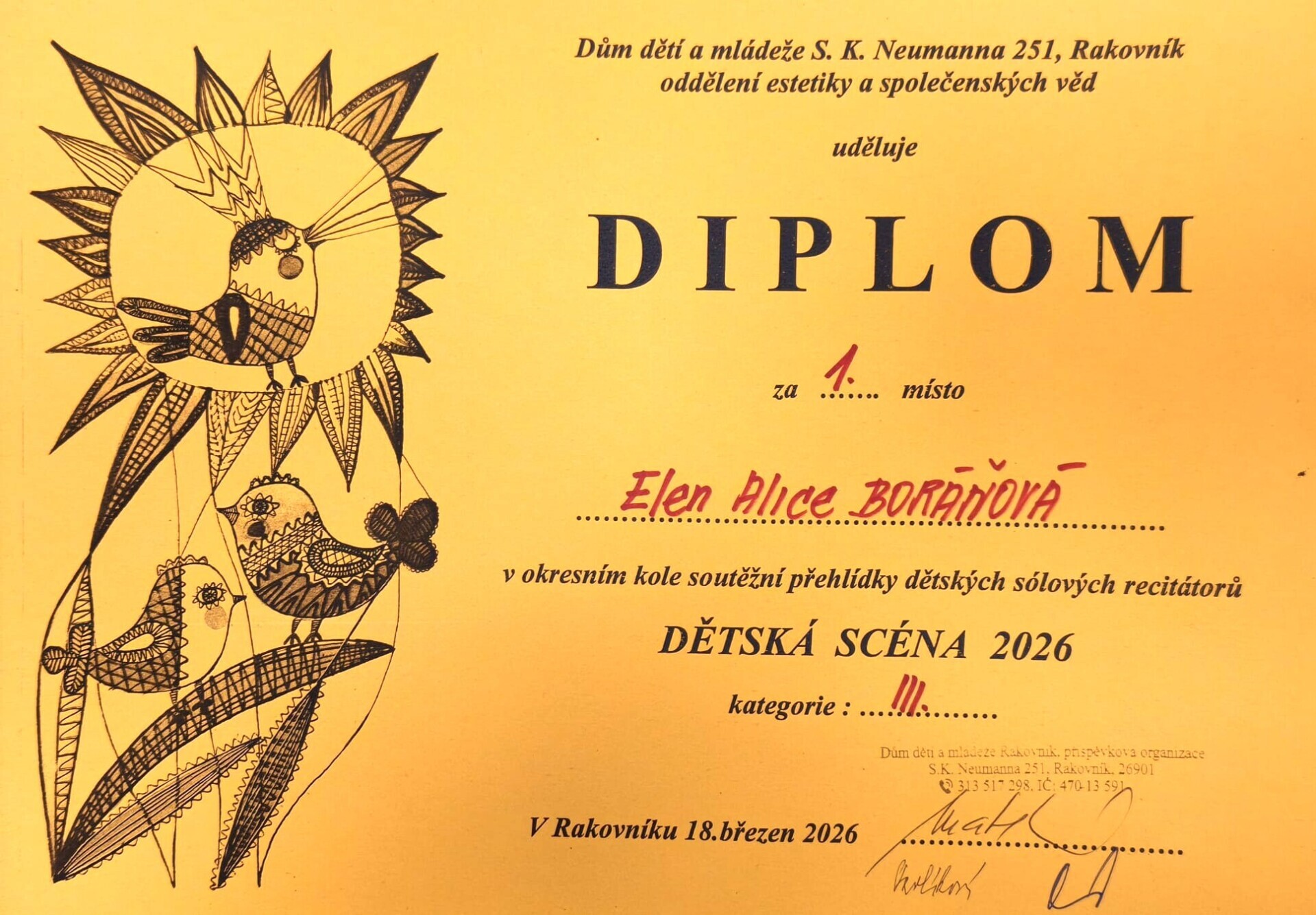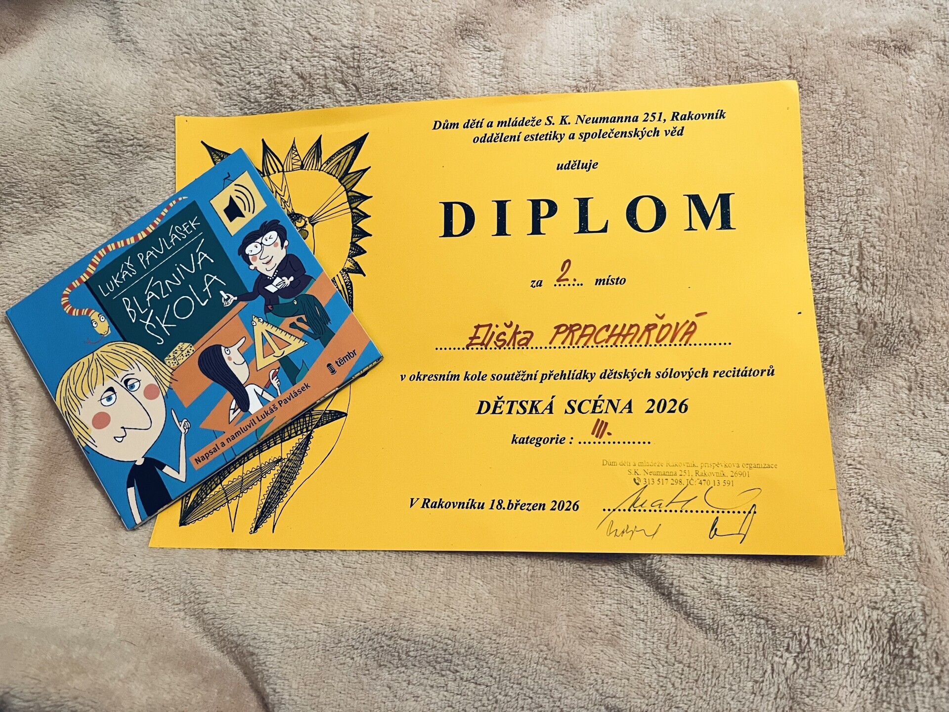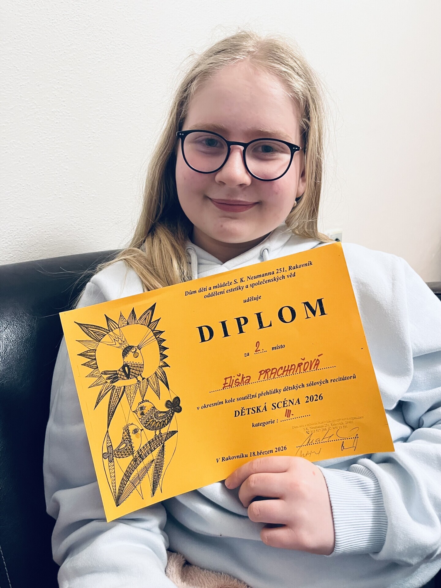 Dne 18. 3. 2026 proběhlo okresní kolo soutěže Dětská scéna v prostorách DDM Rakovník. Zúčastnily se ho také dvě žákyně z primy našeho gymnázia.