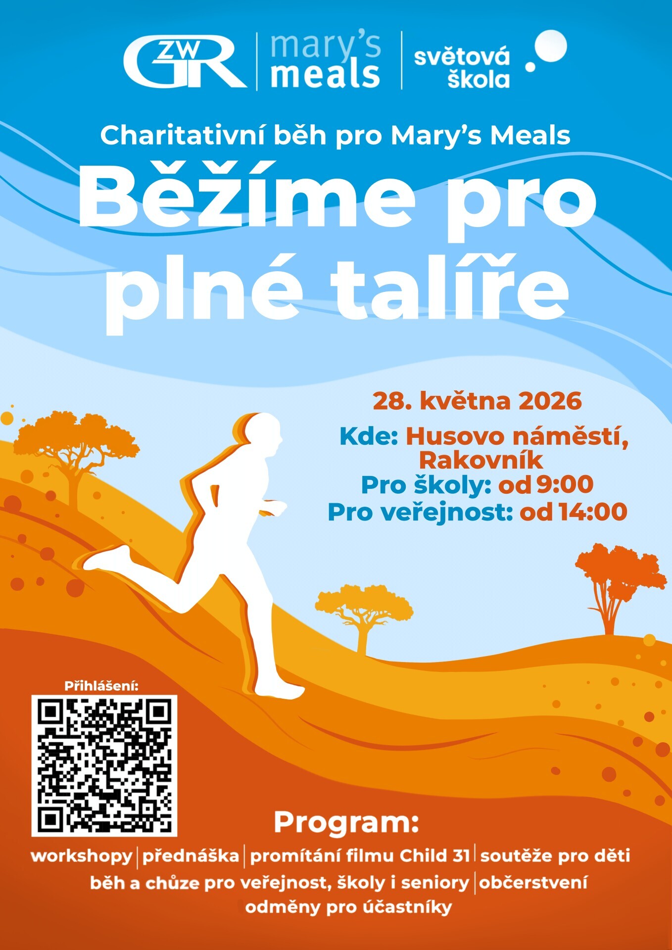 Srdečně vás zveme na charitativní běh, který se uskuteční 28. května 2026 na Husově náměstí v Rakovníku. Naším cílem je podpořit organizaci Mary’s Meals, která zajišťuje školní stravování dětem v nejchudších oblastech světa. Právě díky jídlu, které děti dostanou ve škole, se naděje na lepší budoucnost a cestu ven z chudoby stává skutečností.